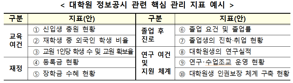 교육부는 기존 대학원 정보공시 지표와 신규 지표 중 현장 관계자들이 생각하는 중요도와 정책적 필요성을 종합적으로 고려해 핵심적으로 관리가 필요한 지표(안)을 선별했다. 선별한 지표(안)에 대해 관계기관 협의, 현장 의견수렴을 추가로 진행할 예정이며, 의견수렴을 거쳐 확정된 주요 지표는 순차적으로 정보공시 시스템에 반영할 계획이다.