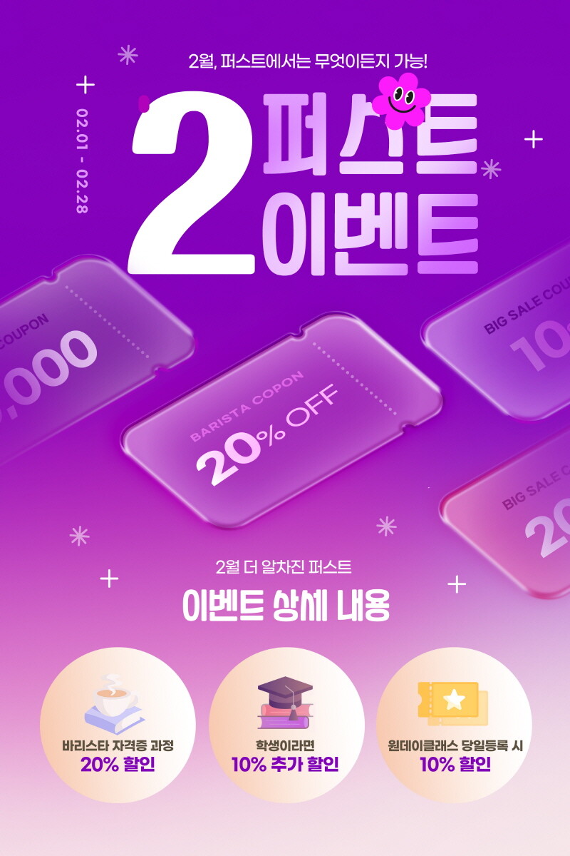 먼저 다른 달보다 짧은 2월이지만 단기 속성으로 진행이 가능한 ‘바리스타 자격증 과정’을 20% 할인된 금액으로 수강할 수 있다.