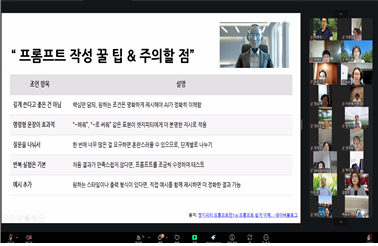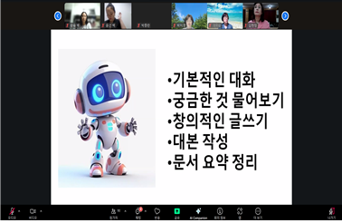 본 교육은 비대면 온라인 방식으로 진행되었으며, ChatGPT를 활용한 텍스트 작성, 이미지 생성, 블로그 제작 등으로 구성되었으며, 실생활에 응용 가능한 프롬포트 활용법과 이미지 생성을 중심으로 실습이 이루어졌다.