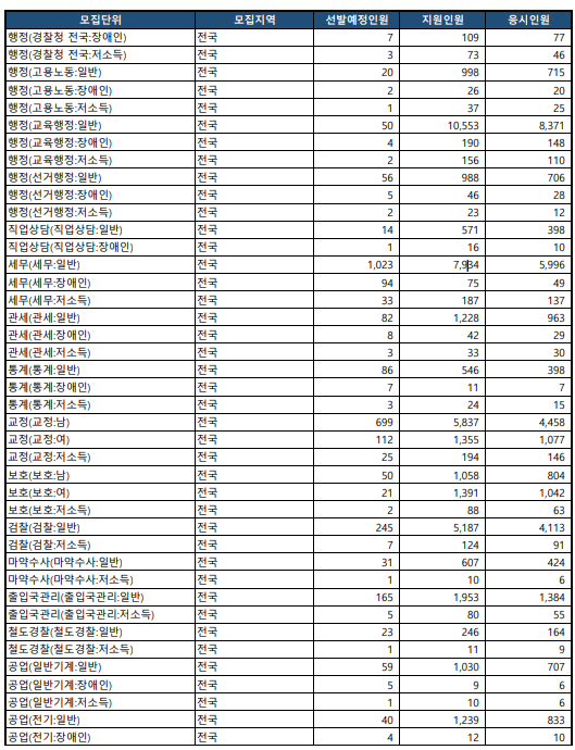 ▲일반행정(지역일반:대전·세종·충남·충북) 77.8% ▲일반행정(지역일반:광주·전남) 79.5% ▲일반행정(지역일반:대구·경북) 77% ▲우정사업본부(지역일반:서울) 74.7% ▲우정사업본부(지역일반:대전·세종·충남·충북) 84.2% ▲우정사업본부(지역일반:인천·경기) 79.8% ▲우정사업본부(지역일반:대구·경북) 83.2% ▲경찰청(전국:일반) 72.8% ▲고용노동(전국:일반) 71.6% ▲교육행정(전국:일반) 79.3% ▲선거행정(전국:일반) 71.5% ▲직업상담(전국:일반) 69.7% ▲세무(전국:일반) 75.6% ▲관세(전국:일반) 78.4% ▲통계(전국:일반) 72.9% ▲교정(전국:남 76.4%/여 79.5%) ▲보호(전국:남 76%/여 75%) ▲검찰(전국:일반) 79.3% ▲마약수사(전국:일반) 69.9% ▲출입국관리(전국:일반) 70.9% ▲철도경찰(전국:일반) 66.7% ▲일반기계(전국:일반) 68.6% ▲전기(전국:일반) 67.2% ▲일반농업(일반) 75.4% ▲산림자원(일반) 76.8% ▲일반토목(일반) 73.6% ▲시설(일반) 71% ▲전산(전산개발:일반) 71.5% 등으로 집계됐다.