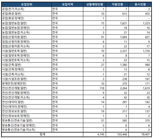 인사처에 따르면, 올해 국가직 9급 공채 필기시험에는 전체 10만3,446명이 지원하였으며 이 중 7만8,407명이 응시한 것으로 나타났다. 이는 지난 시험당일인 23일에 발표된 잠정집계보다 22명 줄어든 수치다.