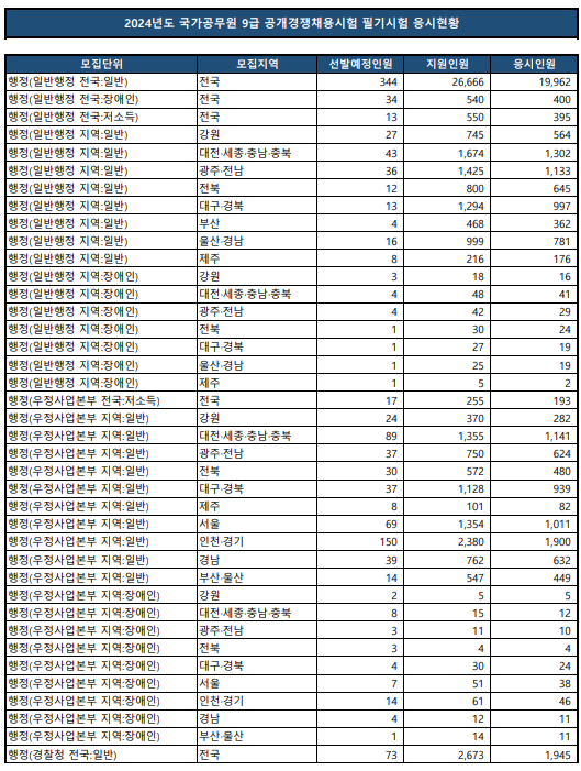 [피앤피뉴스=마성배 기자] 지난 3월 23일 실시한 2024년 국가직 9급 공채 필기시험 응시현황이 지난 15일 발표됐다.