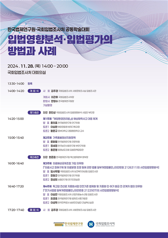 [피앤피뉴스=마성배 기자] 한국법제연구원(원장 한영수)이 내일(28일) 오후 2시 국회입법조사처 대회의실에서 ‘입법영향분석·입법평가의 방법과 사례’를 주제로 국회입법조사처와 공동 학술대회를 개최한다.