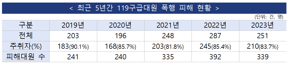 구급대원들의 안전도 중요한 이슈로 다루어졌다. 최근 5년간 1,185건의 구급대원 폭행 사건이 발생해 매년 약 309명의 구급대원이 피해를 입고 있는 상황이다.