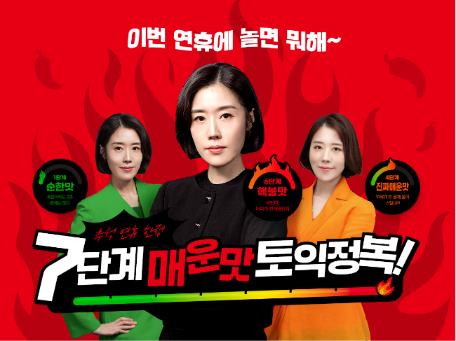 이번 추석 특강은 단기간에 토익 점수 향상을 원하는 수험생들을 위한 것으로, ‘7단계 매운맛 커리큘럼’ ▲1단계(순한 맛) ’토린이’라도3초 문제는 많고 많다 ▲2단계(알싸한 맛) 고수들도 틀리는 문법 문제 마스터하기 ▲3단계(화끈한 맛)완전히 새로운 스피드와 정확도의 세계 ‘콜로케이션’ ▲4단계(진짜 매운 맛) ‘Part6‘ 문제풀이 스킬올리기 ▲5단계(불타는 맛) 독특한 문해력과 단어 재표현의 집결체, ‘Part7’ 단일지문 ▲6단계(핵불맛) 보인다, 어디가 연계형인지 느낌이 온다! ‘Part7’ 다중지문 ▲7단계(시원하게 마무리) Q&A/TIP대방출 등으로 구성된다.