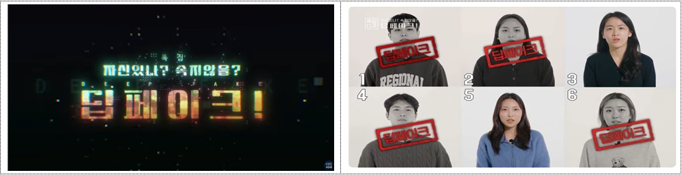 ’24년 4월에 방송된 언론재단‧한국방송공사(KBS) 공동기획 특집 다큐 <자신 있나? 속지 않을? 딥페이크!>에서는 인공지능(AI) 기술발달로 인한 첨단 조작기술(딥페이크)의 심각성과 사회적 파장에 대해 진단했다.(사진=문화체육관광부)