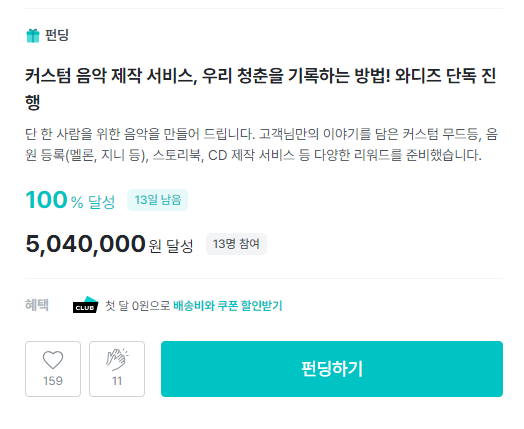 맞춤형 음악 제작 서비스를 제공하는 ‘뮤직포유’는 와디즈에서 진행한 펀딩 시작 4시간 만에 목표 금액인 5,000,000원을 100% 달성했다고 밝혔다.