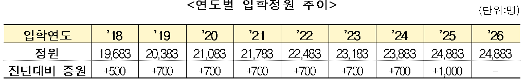[피앤피뉴스=마성배 기자] 보건복지부(장관 조규홍)는 2026학년도 간호대학 입학정원을 2025학년도와 동일한 24,883명으로 유지한다고 27일 밝혔다. 이에 따라 2024년 대비 1,000명 증원된 2025학년도 정원 수준이 그대로 유지되며, 추가 증원은 당분간 이뤄지지 않는다.