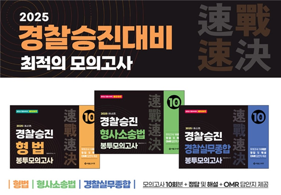 도서출판 서울고시각은 경찰승진 시험을 대비해 ‘2025 속전속결 경찰승진 형법·형사소송법·경찰실무종합 봉투모의고사(10회분)’ 교재를 각각 출간했다.