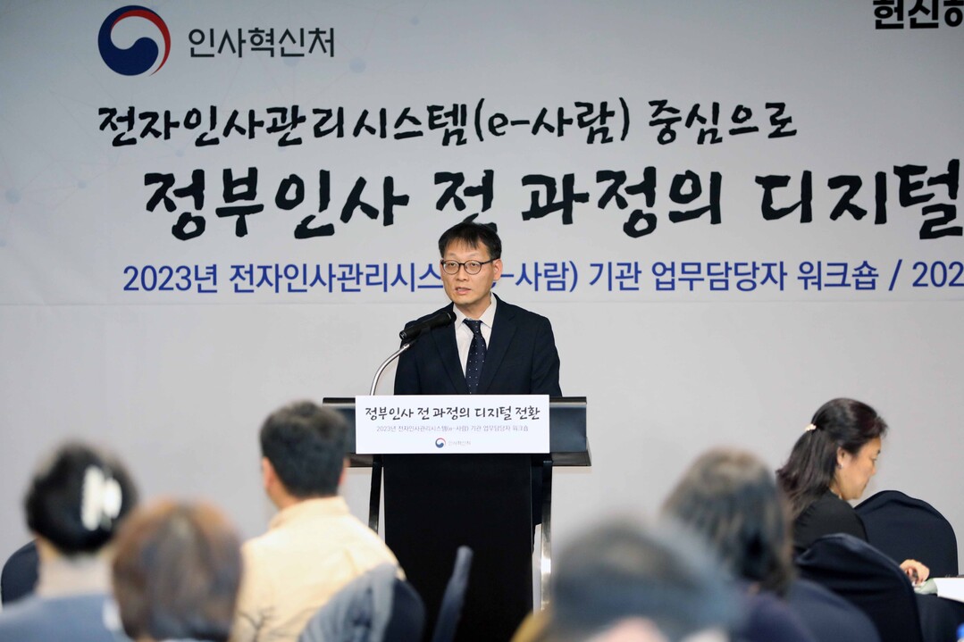 <이인호 인사혁신처 차장이 2023년 11월 21일 세종시 베스트웨스턴 플러스 호텔에서 열린 '2023년 전자인사관리시스템(e-사람) 기관 업무담당자 워크숍'에 참석해 인사말을 하고 있다. 사진=인사혁신처>