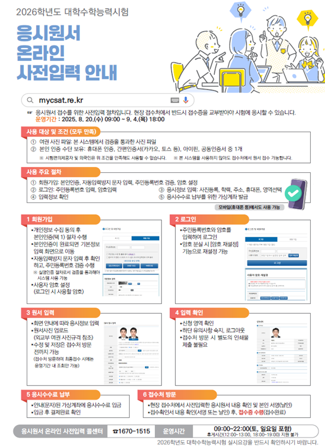 온라인 사전입력은 8월 20일(수) 오전 9시부터 9월 4일(목) 오후 6시까지 진행되며, 기간 중에는 주말을 포함해 24시간 입력이 가능하다. 이후 수험생은 현장 접수 기간인 8월 21일(목)부터 9월 5일(금)까지(토·일 제외, 매일 오전 9시~오후 5시) 접수처를 방문해 신분 확인과 접수증 발급을 받아야 한다.