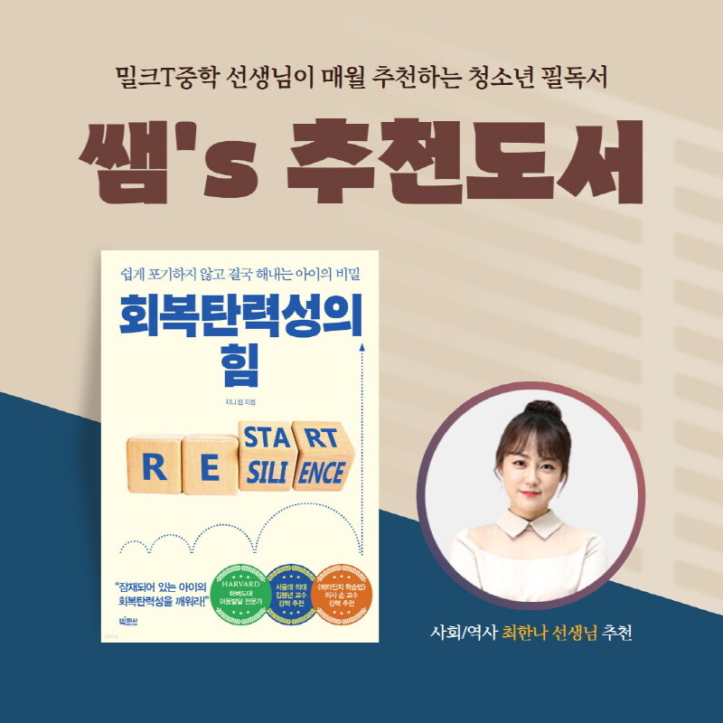 이에 천재교육 관계사인 천재교과서가 만든 중등인강 밀크T중학은 학생들의 학습 동기를 끌어올리고 긍정성과 자기조절능력을 키워주기 위해 9월의 청소년 필독서로 ‘회복탄력성의 힘’을 소개했다.
