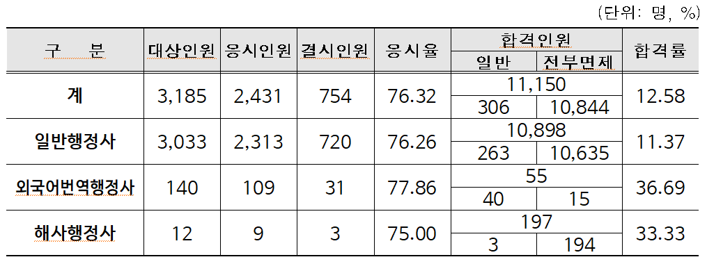 한편, 지난해 제11회 시험에서는 2,040명이 응시해 298명이 최종 합격했다. 일반행정사의 합격률은 13.43%, 외국어번역행정사는 32.52%, 해사행정사는 25.00%였다.