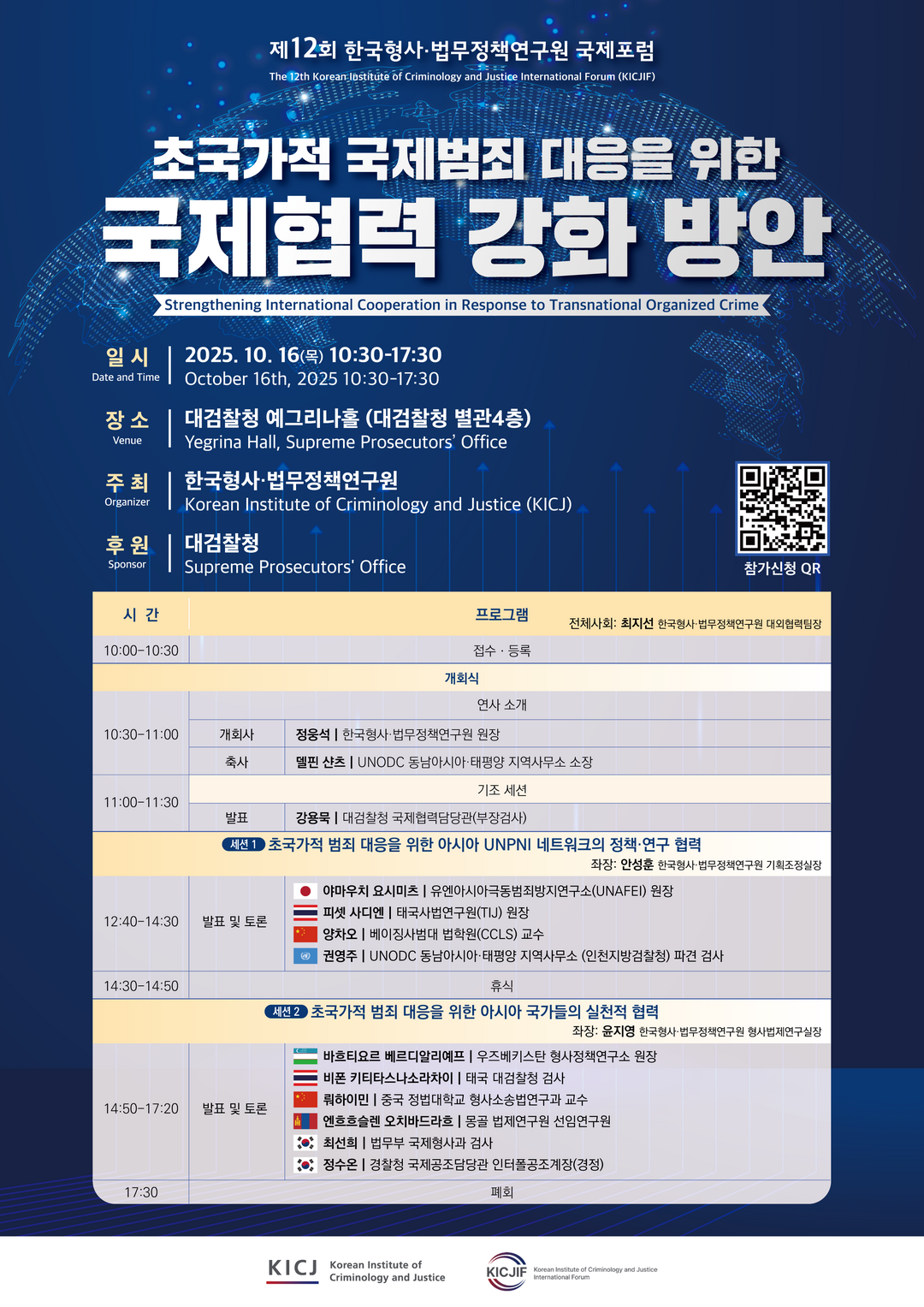 또한 중국 형사소송법학회, 태국 대검찰청 연구소, 몽골 법제연구원, 우즈베키스탄 형사정책연구소 등 아시아 각국의 유관 기관 관계자들도 함께하며, 국제 형사사법 협력의 실질적 네트워크 확대 방안을 논의할 예정이다.