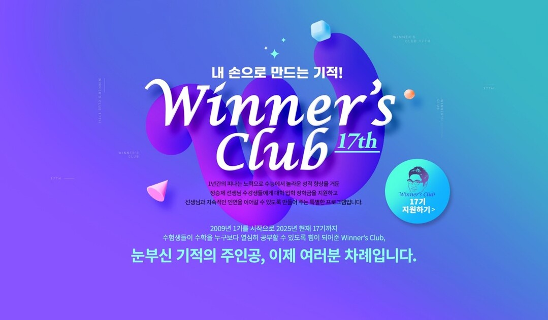 ‘위너스클럽’은 2009년 1기를 시작으로 현재 17기까지 이어지고 있다. 지난 7월 진행된 17기 1차 신청은 뜨거운 관심 속에 모집 마감되었다. 이번 2차 모집은 9월 30일부터 10월 24일까지 진행되며, 해당 기간을 놓쳤다면 수능 성적표 발급 후 진행되는 최종모집을 통해 다시 장학금에 도전할 수 있다.