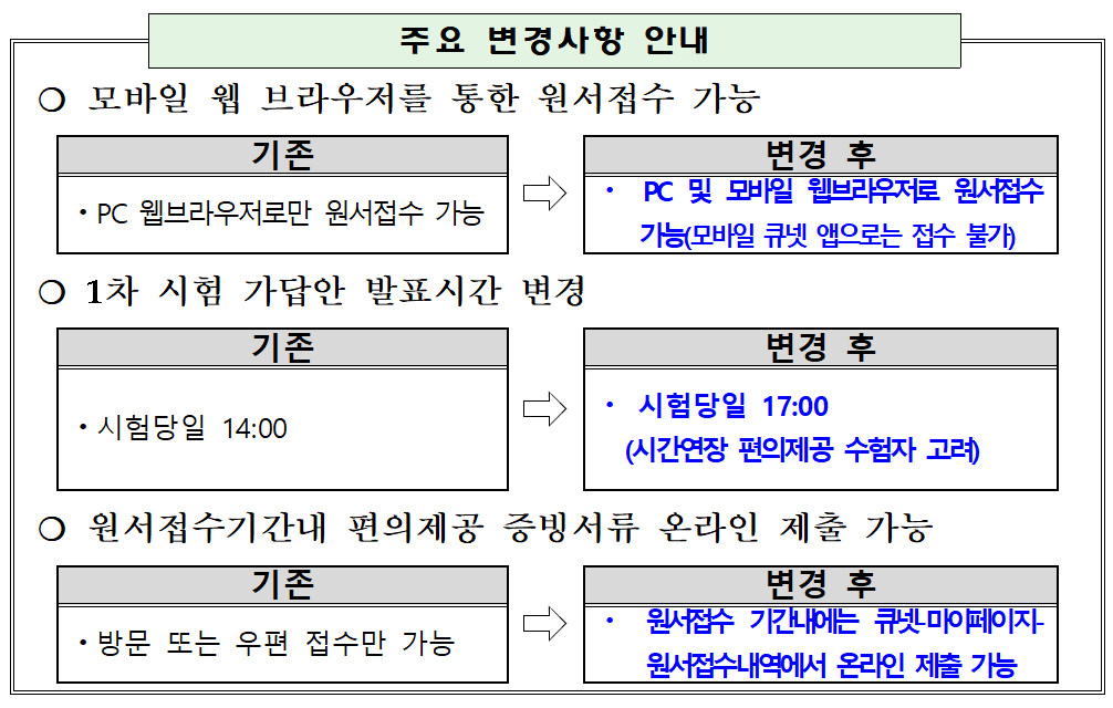 또한, 1차 시험 가답안 발표시간이 기존 시험당일 14시에서 17시로 연장돼, 시간 연장 편의제공 수험자에 대한 배려가 강화됐다.