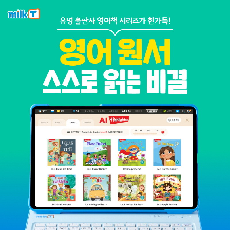 이에 천재교육 관계사 천재교과서가 만든 초등 1위 디지털학습지(2024 한국갤럽 디지털학습 소비자 조사 기준, 브랜드 점유율 1위) 밀크T초등은 세계 유명 출판사 도서 중 초등학생 눈높이에 맞는 책을 엄선, 제공하며 영어 홈스쿨링을 지원하고 있다.
