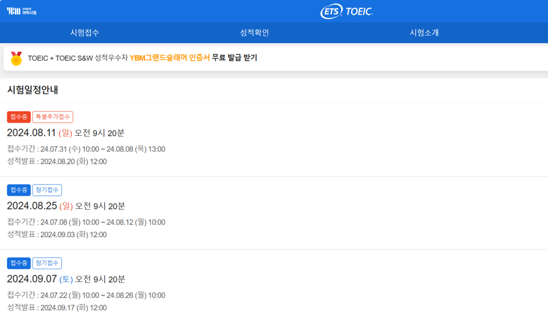 현재 8월 11일, 8월 25일, 9월 7일 토익 시험 접수가 진행 중이다.