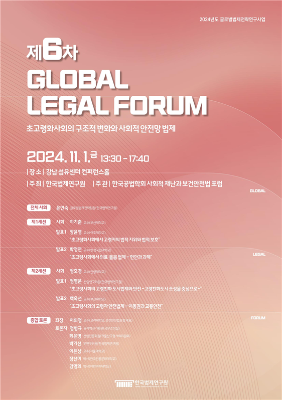 [피앤피뉴스=서광석 기자] 한국법제연구원(원장 한영수)이 내달 1일 강남 섬유센터 컨퍼런스홀에서 ‘초고령화사회의 구조적 변화와 사회적 안전망 법제’를 주제로 2024년 제6차 글로벌 리걸 포럼을 개최한다.