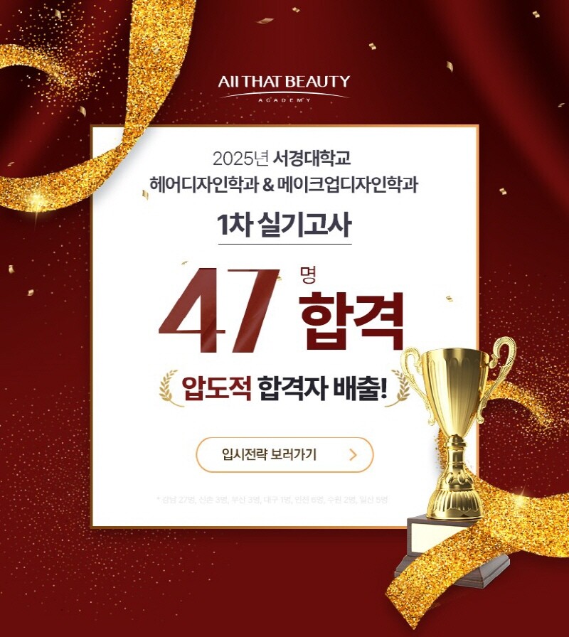 올댓뷰티아카데미 관계자는 “서경대 1차 실기고사에서 47명의 압도적인 합격자를 배출하며, 차별화된 입시 시스템의 성과를 입증했다”며 “수험 기간 서경대 입시에 온 힘을 다했던 수강생들이 좋은 결과를 얻을 수 있게 되어 기쁘며, 앞으로 남은 입시 과정에서도 좋은 결과를 얻을 수 있도록 최선을 다해 지원할 것”이라고 전했다.