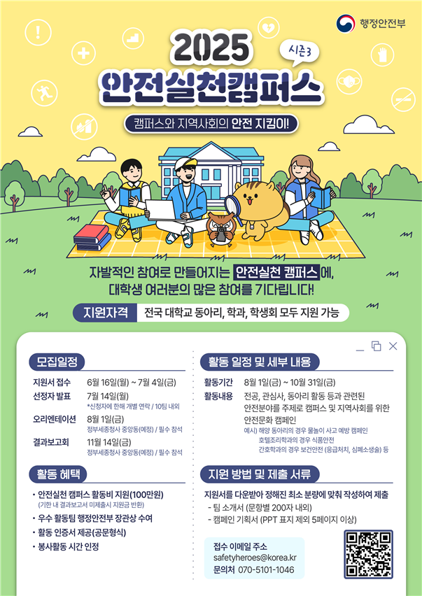 올해로 3회째를 맞는 ‘안전실천 캠퍼스’는 대학생들이 주도적으로 기획한 안전 캠페인을 통해 캠퍼스와 지역사회에 안전 문화를 확산시키는 프로그램이다. 지원 자격은 대학·산업대학·전문대학·방송대학 등 「고등교육법」상 대학에 재학 중인 학생이라면 누구나 팀을 구성해 지원할 수 있다.