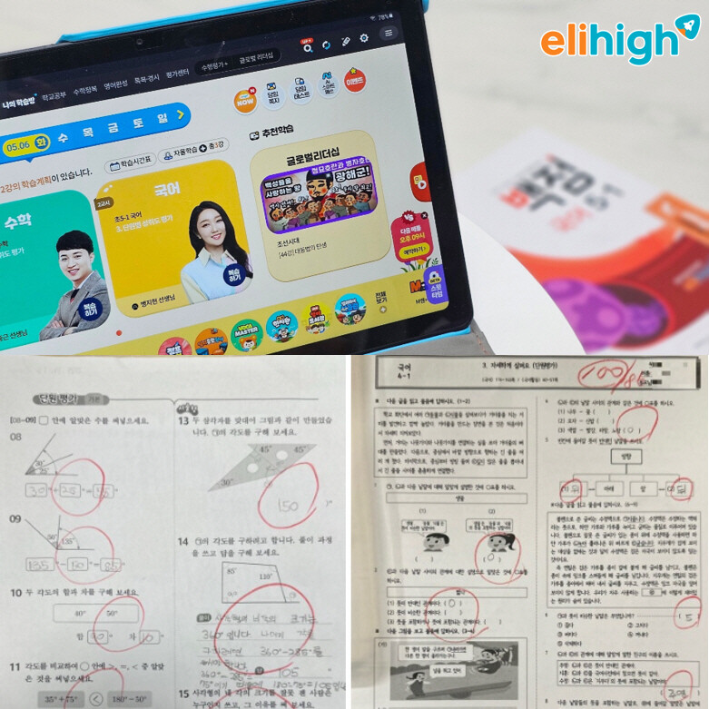 “목요일엔 학원 일정이 많아서 엘리하이 학습 분량도 조절해요. 아이는 현재 사회, 과학, 국어, 독해(빠작 국어), 영어, 수학까지 학습 중이에요. 수학은 ‘디딤돌 수학’ 교재와 연계해 활용할 수 있어서 더 만족스럽습니다.”