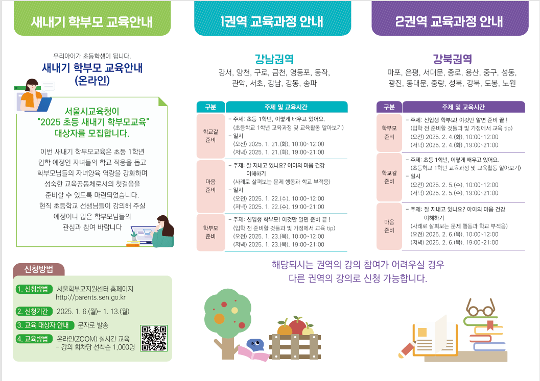 또한, 학부모 교육 프로그램 ‘초등 새내기 학부모교육’도 온라인으로 진행된다. 현직 초등학교 교사가 진행하는 강의는 △초등학교 교육과정 및 교육활동 △아이의 정서 이해 △입학 전 준비물 △가정 내 교육 팁 등을 다룬다. 오는 13일(월)까지 진행되며, 선착순 1,000명이 참여할 수 있다. 신청은 서울시교육청 학부모지원센터 누리집에서 가능하다.