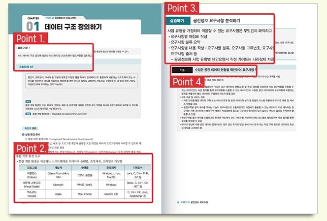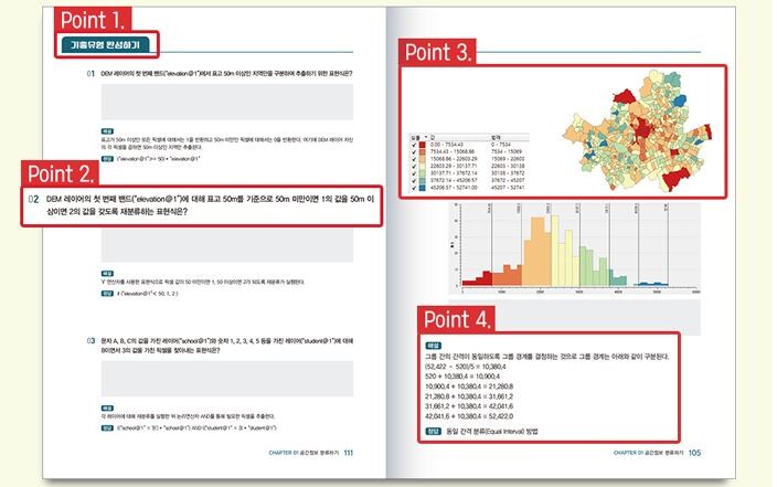 수험서를 보면 NCS의 공간정보융합서비스 분야에 해당하는 관련 기출문제를 완벽 분석하여 추출한 대표 기출유형으로 선정했으며, 필수 이론을 응용해보는 실습하기 과정을 통해 수험생 입장에서 짧은 시간 동안 자격증 준비가 가능하도록 구성했다.