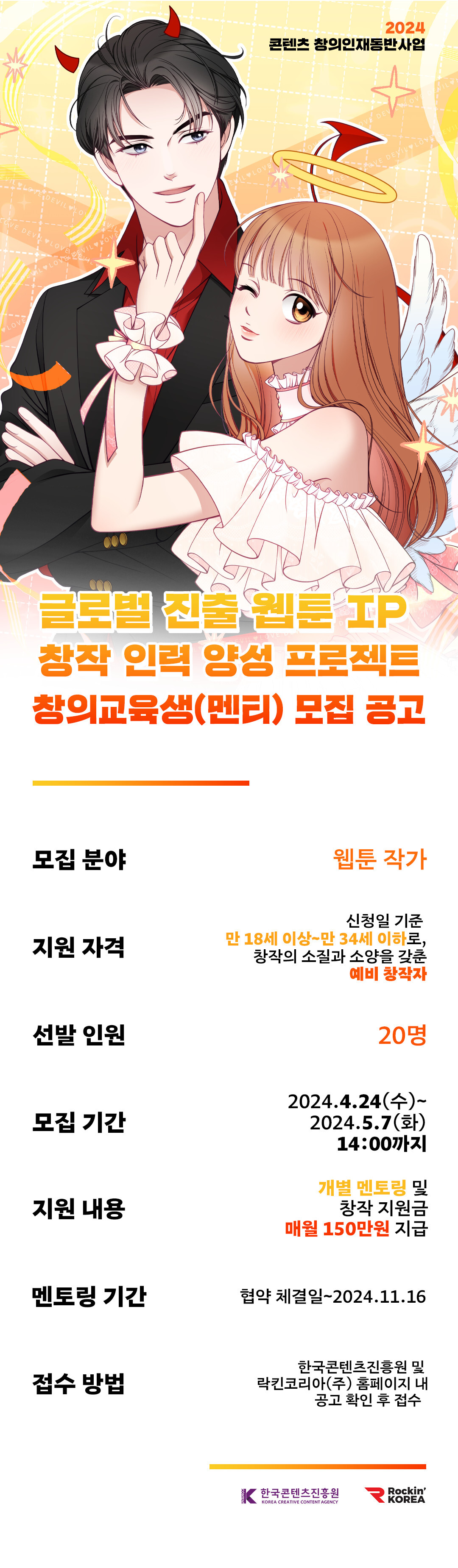 ‘글로벌 진출 웹툰IP 창작인력 양성 프로젝트’ 사업은 락킨코리아의 콘텐츠 창의인재동반사업 멘토링 과정으로 대한민국 대표 웹툰 작가, 웹툰 산업 관계자 및 기획자들이 멘토로 참여하며 1:1 멘토링을 통해 역량 있는 창작자를 글로벌 시장에 진출시키는 것을 목표한다. 1차 서류심사, 2차 대면심사를 거쳐 총 20명의 교육생(멘티)를 선발해 5월 20일부터 11월 16일까지 멘토링을 진행하게 된다.