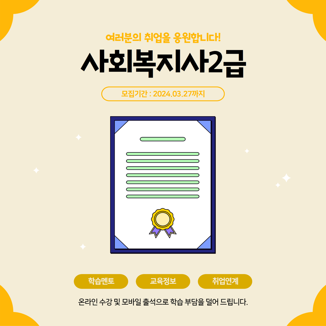 2020년 개정법이 바뀌면서 새롭게 변경된 교육과정을 적용해 이론 16과목과 실습 1과목을 이수하면 사회복지사2급자격증을 발급하고 있다. 학력조건은 전문대졸 이상의 학력이 필요하지만 학점은행제를 동시에 이용하면 고등학교 졸업자들도 제약 없이 도전할 수 있다. 단, 학력에 따라 취득 기간은 상이할 수 있다.