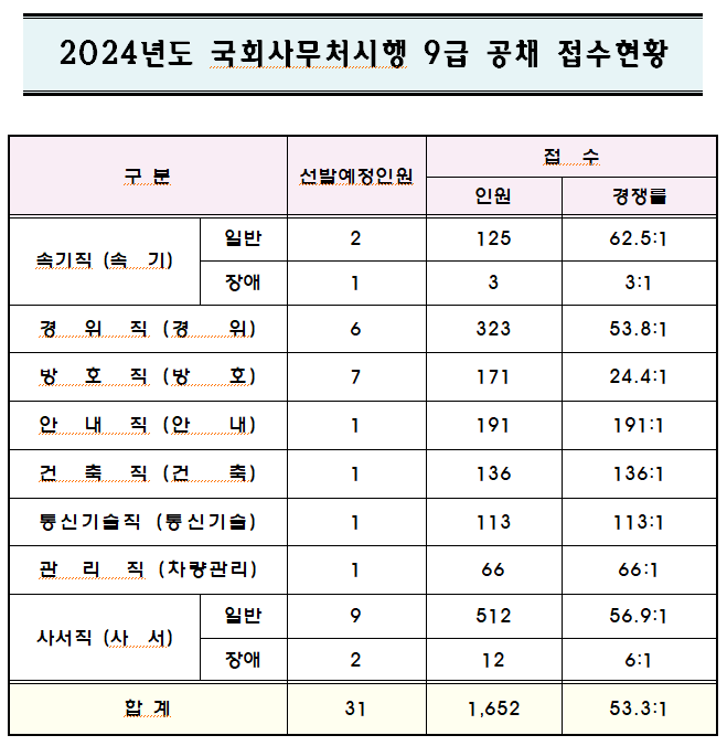 지난 5일 국회사무처는 ‘2024년도 국회사무처시행 9급 공채 접수현황’에 따르면, 최종 31명을 선발하는 올해 시험에는 1,652명이 원서를 접수하여 평균 53.3대 1의 경쟁률을 기록했다고 밝혔다.