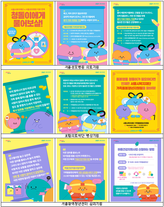 서울시복지재단은 올해부터 가족돌봄청년(청소년 포함)이 시기를 놓치지 않고 의료·심리·금융 서비스를 언제든지 신청해 지원받을 수 있도록 관련 기관과 연계한 상시서비스를 운영 중이라고 16일 밝혔다.