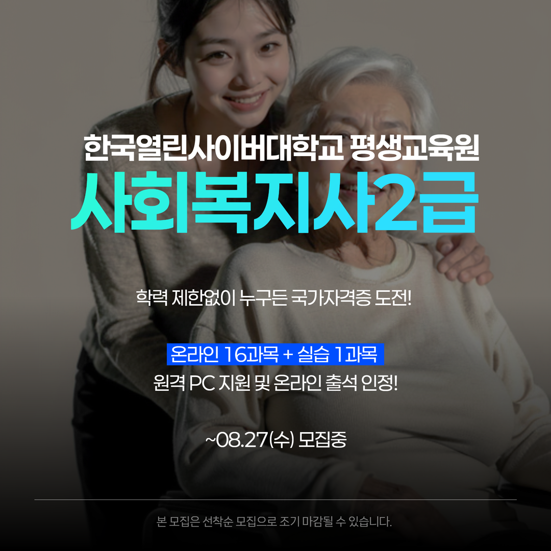 한국열린사이버대학교 평생교육원은 보건복지부가 발급하는 국가자격인 사회복지사 2급 과정 수강생을 오는 8월 27일(수)까지 모집한다고 밝혔다. 본 과정은 8월 28일(목) 개강하며, 온라인 수업과 현장 실습을 병행하는 방식으로 운영된다.