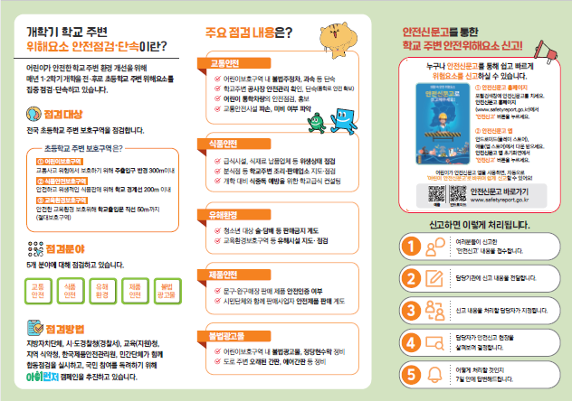 국민 누구나 초등학교 주변에서 청소년 유해 표시 미이행 업소, 불량 식품, 안전 인증 미확인 제품 등을 발견하면 안전신문고를 통해 신고할 수 있다. 접수된 신고는 담당 기관이 확인해 7일 이내 조치 결과나 계획을 안내한다.