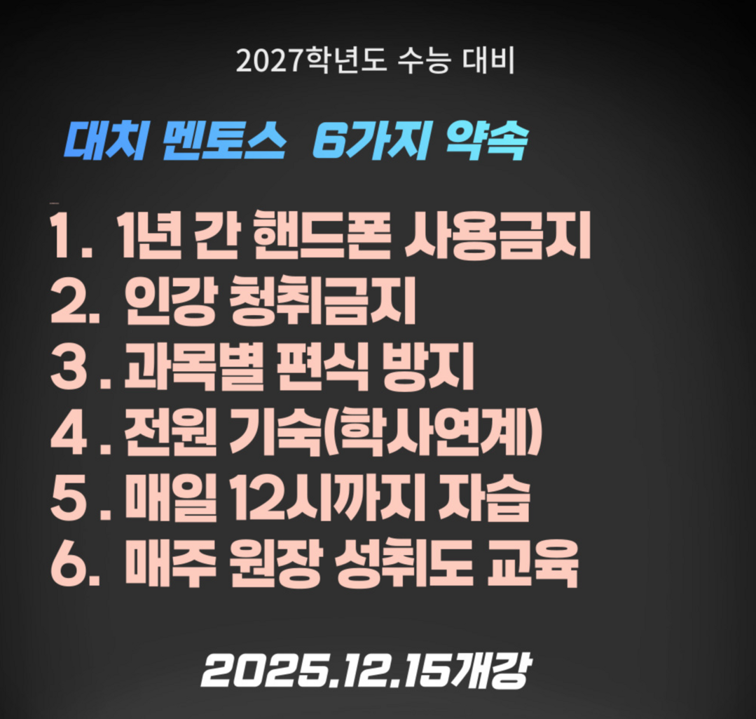대치동 멘토스학원은 소수정예 재수학원의 원조학원으로 24년 된 강남 대치동에서 메가스터디 다음으로 오래된 학원이다. 2027년 수능대비 재수반은 예약중에 있다. 1990년으로 돌아가서 1년동안 핸드폰을 쓸 수 없는 빡센 재수학원 컨셉이다. 인강보다는 현강으로 모습수업 후 확실한 복습을 하게하고 전원기숙으로 학사 연계 시스템으로 운영 예정이고 한반 정원 9명, 4개반만 모집예정이다. 개강은 12월 15일이다.