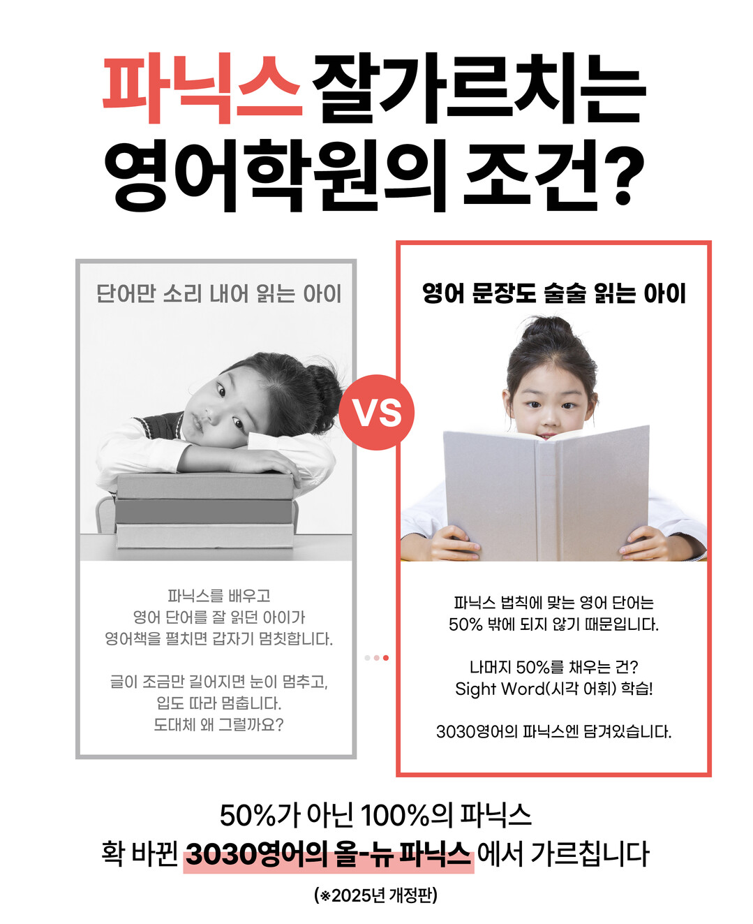 3030영어 윤성민 이사는 “기존 초등영어학원 교재들 가운데 Sight Word를 파닉스의 핵심 요소로 다룬 경우는 드물다”며, “3030영어는 Sight Word를 단순 암기 수준이 아닌 읽기 유창성까지 끌어올릴 수 있도록 구조화한 점에서 확실한 차별성이 있다”고 강조했다.