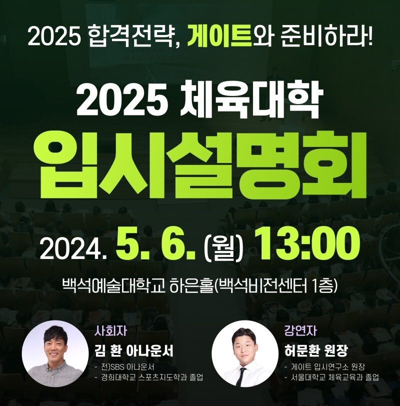 오는 5월 6일(월) 서울 방배동 백석예술대학교 하은홀(백석비전센터 1층)에서 오후 1시에 열리는 이번 설명회는 경희대학교 체육대학 출신, 전 SBS 김환 아나운서가 사회를 맡았으며, 성균관대학교 스포츠경영학 박사 김국진 대표원장의 전략 보고서를 바탕으로 서울대학교 체육교육학과 출신 허문환 총괄원장이 직접 강연을 진행할 예정이다. 게이트의 입시설명회는 매년 서로 다른 교육기관에서 개최하는 체육대학 입시설명회 중 최대 규모로, 매년 1,000여 명의 학부모와 수험생의 발길이 이어지고 있는 만큼 올해는 20년 전 게이트 체대입시를 창업한 광운대학교 김준희 교수와 경희대학교 오경록 학장 그리고 대치동 일타 원장진의 인사말도 있을 예정이다. 올해 체대입시를 준비하는 고3/N수 수험생뿐 아니라 향후 체육대학 입시를 준비를 앞둔 고1, 고2 및 중학생과 학부모들도 참석이 가능하다.