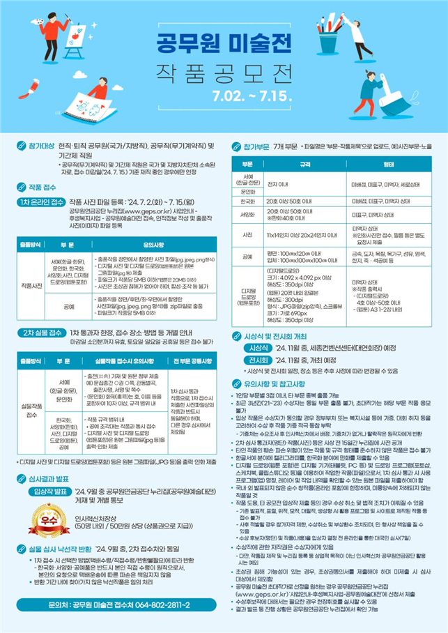 모집 부문은 서예(한글, 한문), 문인화, 한국화, 서양화, 사진, 공예, 디지털드로잉(웹툰 포함) 등 총 7개로 구성되었으며, 디지털 드로잉 부문은 젊은 세대 공무원들의 참여를 활성화하기 위해 지난해 시범 도입된 부문으로, 올해는 온라인 만화(웹툰)도 참여할 수 있도록 범위를 확대했다.