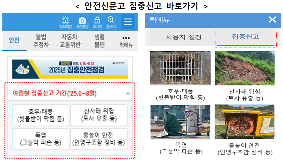 계절별로 위험이 높은 유형을 설정해 집중신고 기간을 지정해 왔으며, 지난해 여름에는 약 2만9천여 건의 제보가 접수됐다. 특히 침수 우려가 컸던 빗물받이 막힘 사례만 1만8천여 건에 달하며, 사전 조치를 통해 풍수해 피해를 줄이는데 기여한 바 있다.