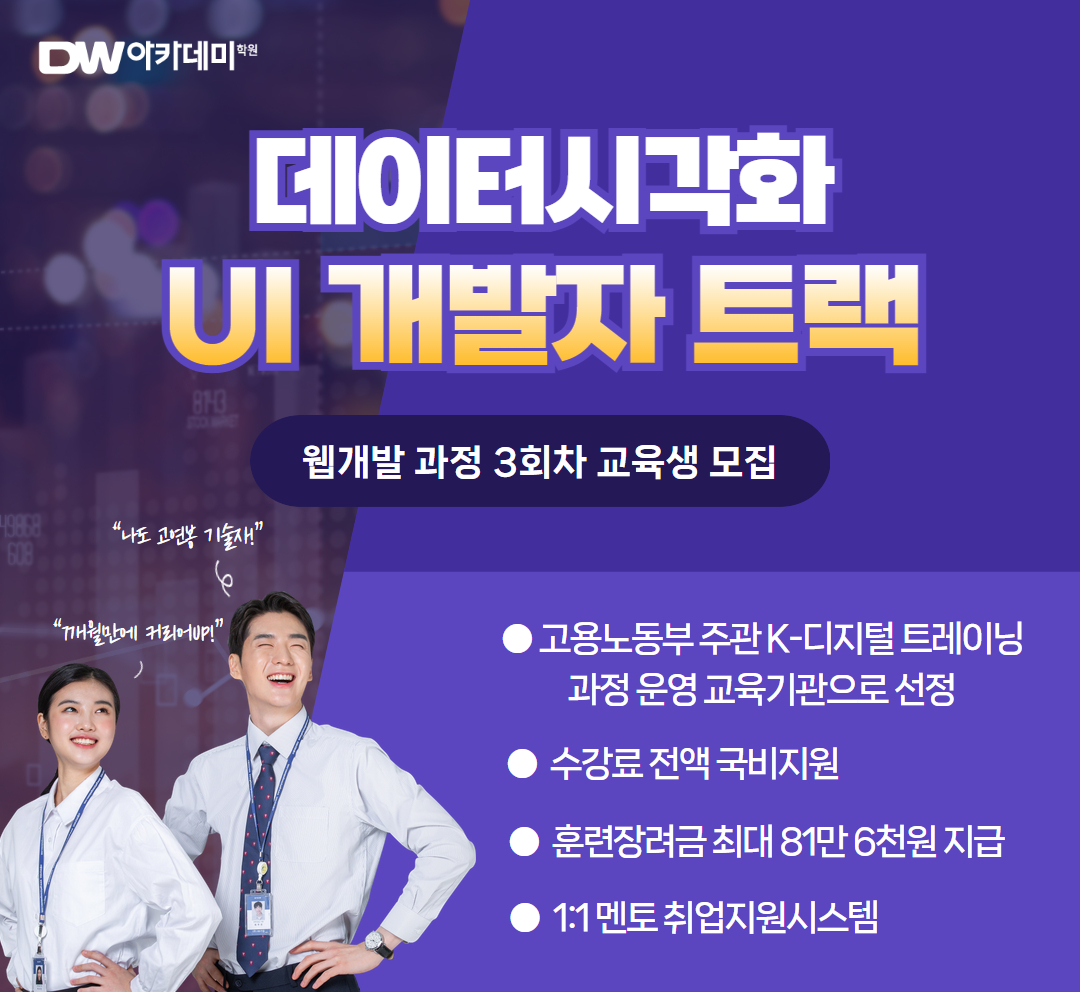 이에 IT·컴퓨터 국비지원 무료교육 전문 대전 DW아카데미학원은 현장 실무를 위한 개발자를 양성하기 위해 프로젝트 기반 <데이터시각화 UI 개발자 트랙 – 3회차> 과정을 오는 3월에 개설한다고 밝혔다.
