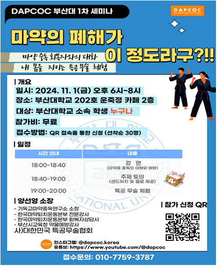 답콕의 박상규 사무총장은 “부산대 DAPCOC 발족을 통해 대학생들이 스스로 예방 활동에 참여함으로써 마약류 중독 예방을 선도하고, 부산 지역의 건강한 캠퍼스 문화를 조성하는 데 기여할 것”이라고 밝혔다.
