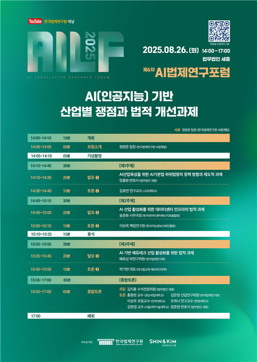 [피앤피뉴스=마성배 기자] 한국법제연구원(원장 한영수)은 26일 오후 2시, 법무법인 세종에서 ‘AI(인공지능) 기반 산업별 쟁점과 법적 개선과제’를 주제로 제6차 AI법제연구포럼을 개최했다. 이번 포럼에는 학계·법조계·연구기관 전문가들이 모여 산업 현장에서 제기되는 법적 쟁점을 다각도로 짚고, 정책·입법 차원의 개선 방향을 심도 있게 논의했다.