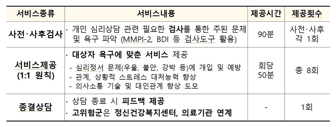 또한 서비스는 사전·사후 검사와 전문심리상담을 3개월 10회를 실시하고 재판정을 통해 최대 1년 이내 연장을 할 수 있다.