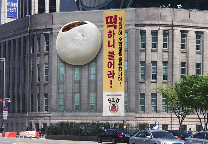 현수막에는 찹쌀떡이 서울도서관 건물에 착 달라붙어 있는 모습이 연출돼 눈길을 끈다. 이는 수험생들이 원하는 대학에 ‘찹쌀떡처럼 붙기를’ 바라는 응원의 메시지를 담은 것이다.