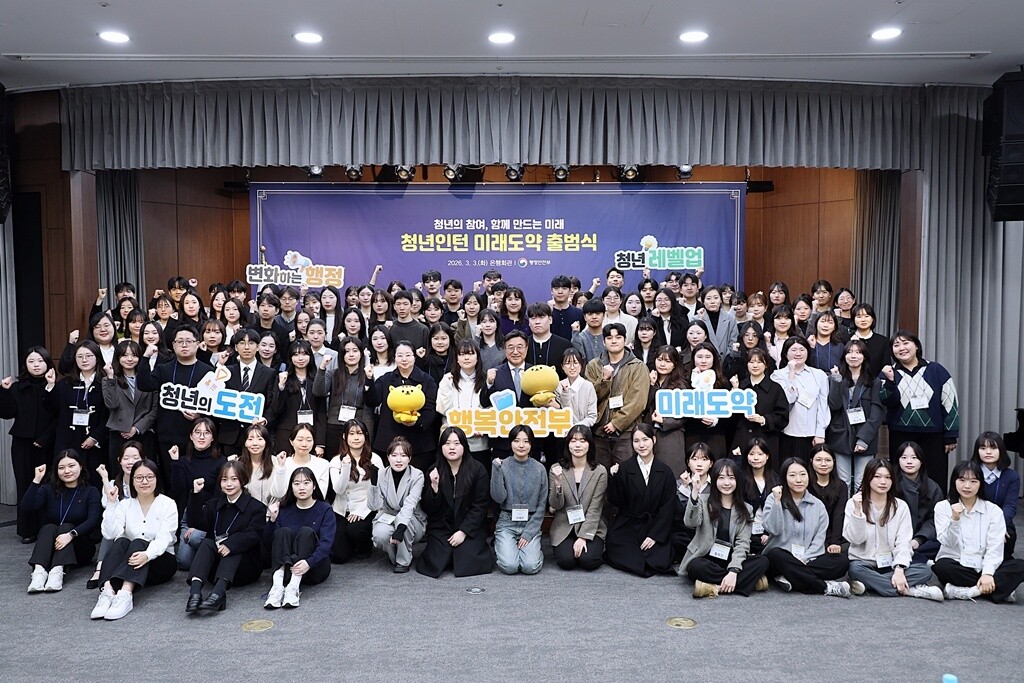 | ▲윤호중 행정안전부 장관이 3일 오전 서울 중구 은행회관 국제회의실에서 열린 2026년 행정안전부 청년인턴 미래도약 출범식에서 단체 기념촬영을 하고 있다. |
