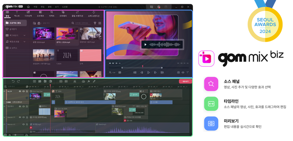 특히 영상 편집 소프트웨어 ‘곰믹스’는 초보자부터 전문가까지 폭넓게 사용할 수 있도록 설계된 영상편집 툴이다. 가벼운 프로그램 용량으로 고사양 장비 없이 저사양 컴퓨터에서도 원활하게 작동할 수 있는 것이 강점으로 꼽힌다. 영상 제작 경험이 없는 이들이라도 쉽게 활용할 수 있도록 2000여 개의 다양한 템플릿을 제공한다.