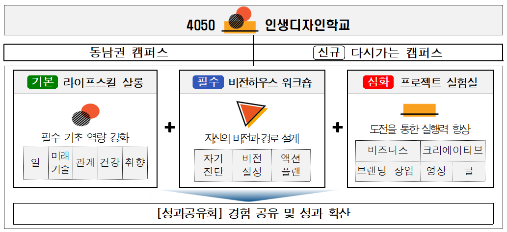 인생디자인학교는 ▲라이프스킬 살롱 ▲비전하우스 워크숍 ▲프로젝트 실험실 등 총 3단계 교육과정으로 구성된다. 참가자들은 일과 기술, 인간관계, 건강, 취향 등 삶의 핵심 주제를 다각도로 점검한 뒤, 10년 후 자신의 모습을 구상하고, 창업·콘텐츠 제작·커뮤니티 활동 등 실제 프로젝트에 도전해 본다.