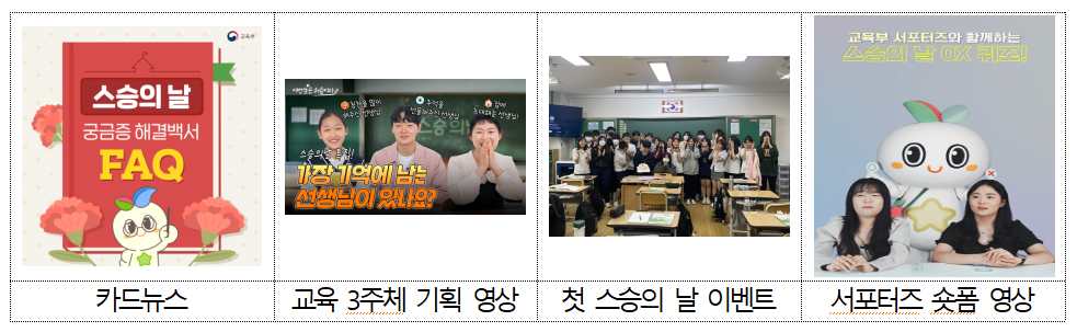 스승의 날 기념식은 선생님들의 자부심과 긍지를 높이고, 학교 구성원 간 상호존중 문화 조성을 목적으로 열리며, 올해는 교권 침해 등으로 사기가 저하된 교원을 응원하고 전 국민이 함께하는 주제로 ‘다시 빛날 선생님의 길을 함께 걸어가겠습니다!’를 선정, 다채로운 행사를 준비했다.