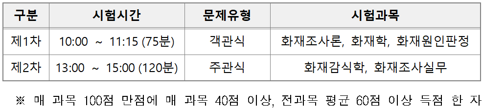 시험에는 전국에서 소방공무원 668명이 응시했으며, 이 중 204명이 최종 합격해 30.5%의 합격률을 기록했다. 1차 시험은 화재조사론, 화재학, 화재원인판정 등을 다루는 객관식 시험으로, 2차 시험은 화재감식학 및 실무 이해 능력을 평가하는 주관식 시험으로 진행됐다.
