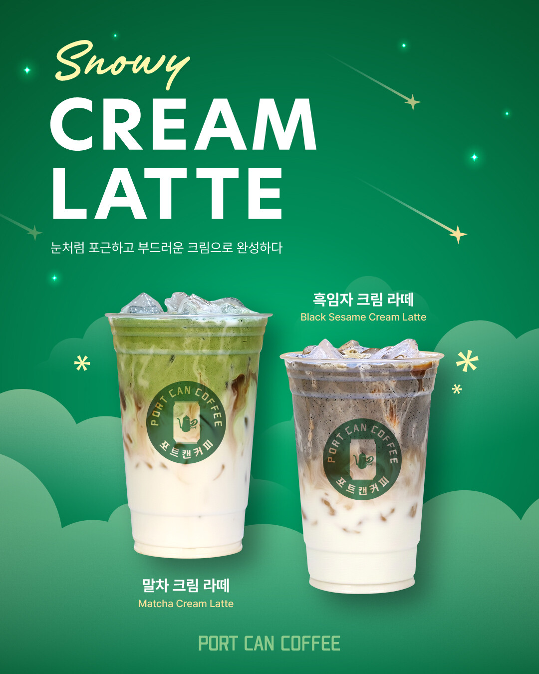 카페 프랜차이즈 포트캔커피가 신메뉴 말차크림라떼와 흑임자크림라떼를 출시하며 크림라떼 라인업을 확대했다.